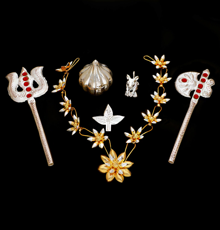 SILVER TRISHUL (70%), SILVER AXE (70%), SILVER FLOWER HAAR (70%), SILVER BEL PAAN (99.99%), SILVER MOOSHAK (92.5%), SILVER MODAK (70%)